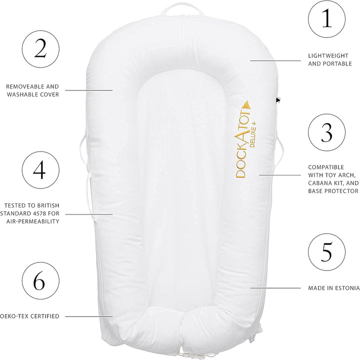 The DockATot Deluxe+ dock is an award-winning multifunctional docking station for babies 0-8+ months old. The Deluxe+ dock is the ideal spot for babies for supervised lounging, playing, resting, cuddling, diaper changesandtummy time. Created to mimic the womb and voted as a must-have baby product from parents around the world, it can be used around the house and is ideal for travel. The Deluxe+ dock adheres to strict standards to ensure a safe environment for little ones. Made in Europe. Features include air permeability and Oeko-Tex Standard 100 Class 1 certification (testing for harmful substances). Additional covers are available for purchase to match your mood, roomandstyle.