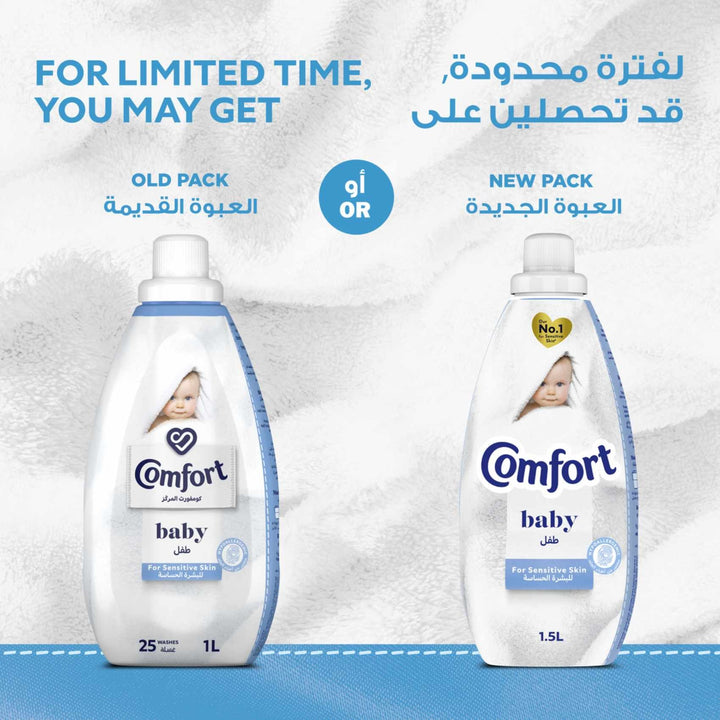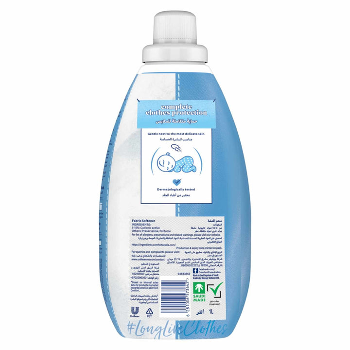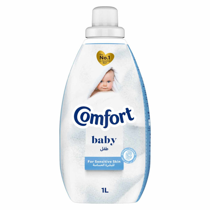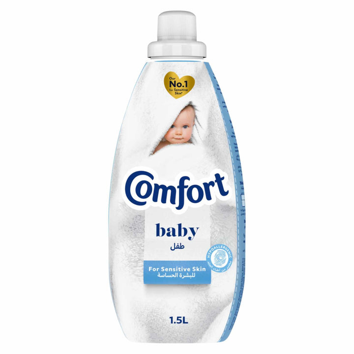 The need for healthy skin is becoming increasingly important. Comfort Baby concentrated fabric conditioner with its hypoallergenic and dermatologically tested formula is not only safe for babies but for everyone with sensitive skin concerns, so gentle and soft even kind on baby’s skin. Comfort baby fabric softener makes your clothes soft, helps you avoid irritation to sensitive skin and gives a mild, gentle fragrance to clothes. It also guarantees a long-lasting fragrance and keeps the clothes fresh throughout the day. Repeated washing with only detergents makes clothes lose their softness and their fibres become rough, which is not suitable for your baby’s skin. Comfort baby coats each fibre of your baby’s clothes in unbeatable softness. It has no dyes and has a mild fragrance, which makes it perfect for a baby’s clothes. Wrap your baby in the unbeatable softness of Comfort. Add it to your washing, along with your favourite laundry detergent, for clothes that are softer and easier to iron. How to use: Pour 1 cap dose straight into the correct compartment of your washing machine drawer along with your favourite laundry detergent. Choose the right wash setting and let your machine take care of the rest, as it releases the fabric conditioner during the final rinse cycle. Safety Information:\• Do not pour directly onto clothes. • Keep out of reach of children. • If contact with eyes occurs, rinse with water. Keep your baby clothes as soft as his gentle skin with Comfort baby laundry conditioner.
