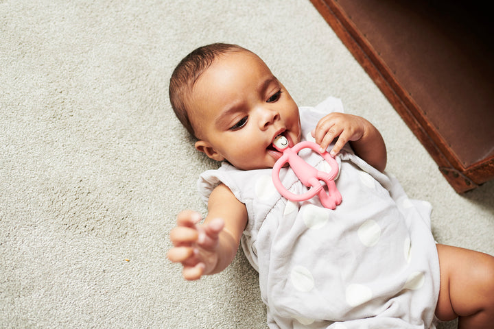 • * A fun soft textured silicone teether providing soothing relief to aching gums