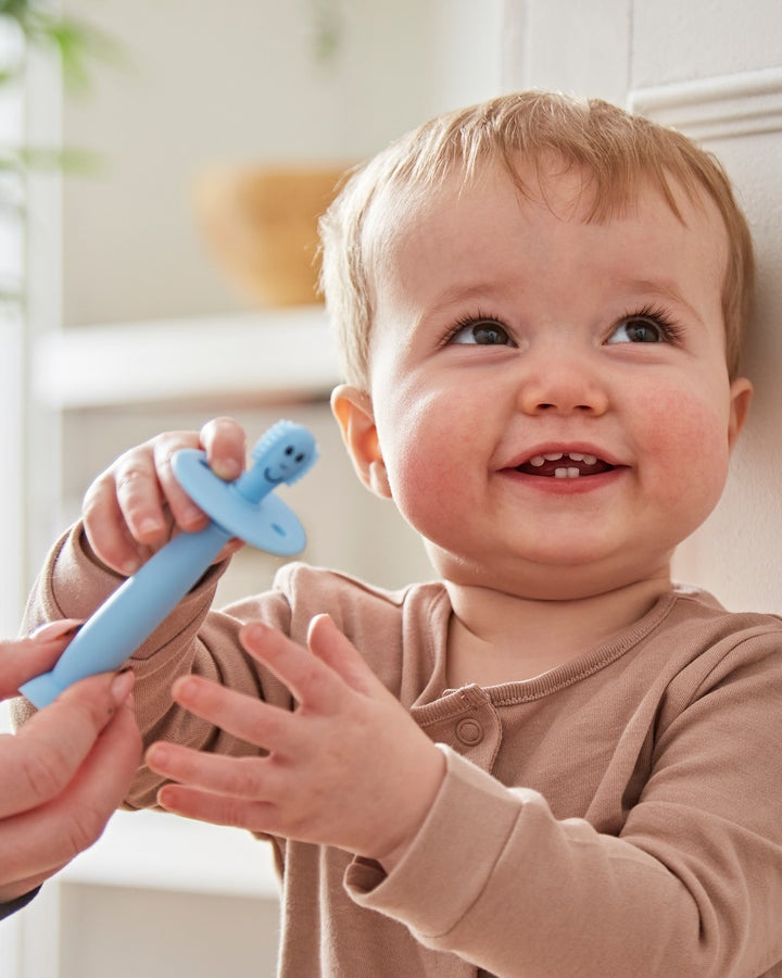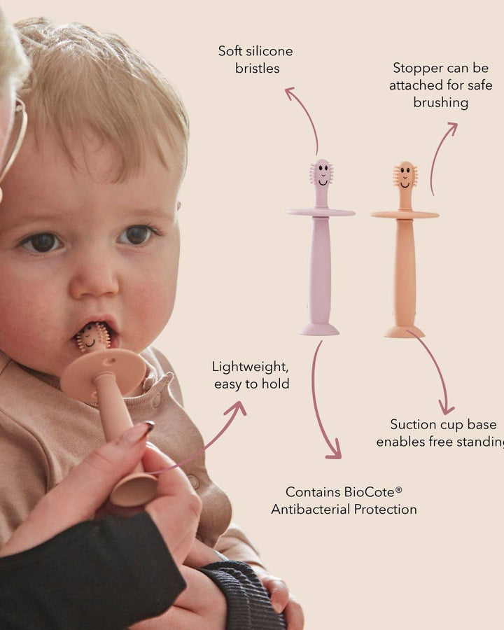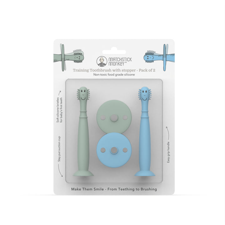 Matchstick Monkey Training Toothbrush with Stopper is the perfect first toothbrush for your baby! Designed to encourage independent brushing, this toothbrush features a soft silicone handle thats easy for little hands to grip and gentle silicone bristles that are kind on new teeth. The built-in stopper ensures safe brushing, while Biocote® Antimicrobial Protection helps keep the brush cleaner for longer. Make brushing a fun and safe experience for your little one!