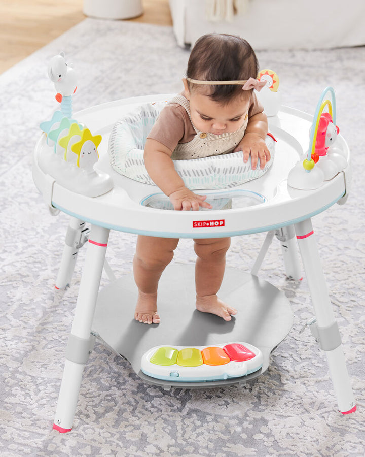 The Skip Hop Silver Lining Cloud Activity Center in Multi Color is a 3-stage developmental play center designed to grow with your baby. From sitting and bouncing to cruising and drawing, it offers 25+ engaging activities to support motor skills, cause and effect learning, and creativity. The 360° rotating seat allows for active movement, while the unique Discovery Window™ lets baby see their feet while playing the light-up piano. Clip-on toys can be repositioned, and as your child grows, it converts into a toddler play table with a chalkboard surface.