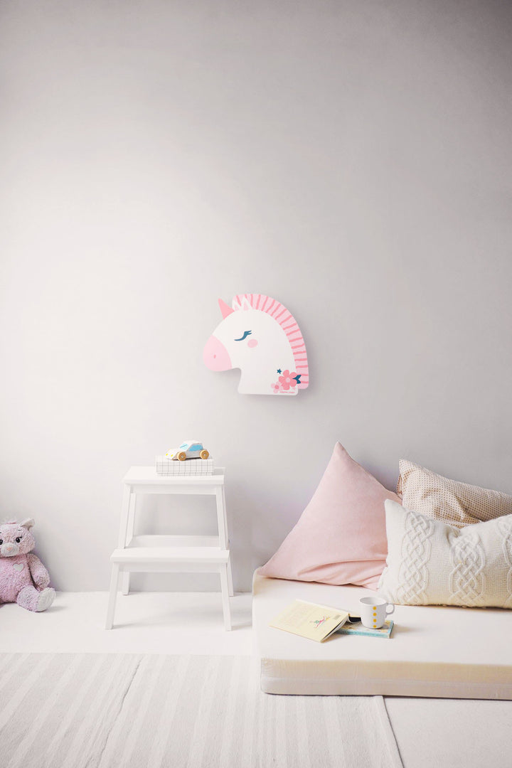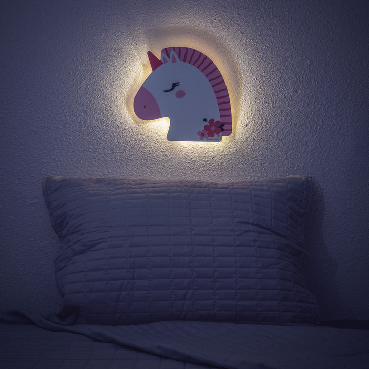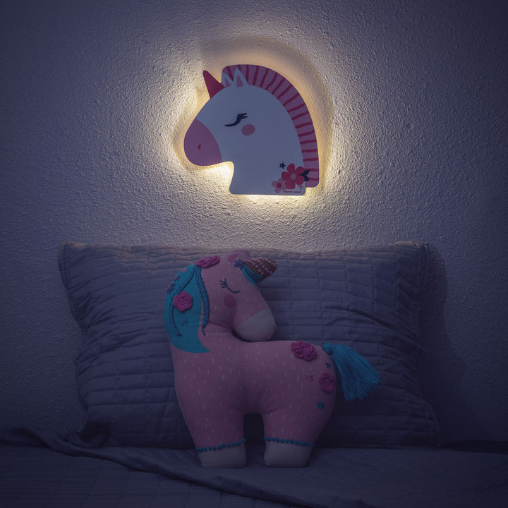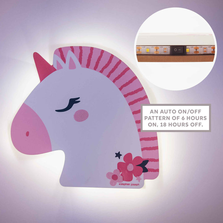 Enchanting night lights fill childrens rooms with a soft and comforting glow. Give kids the ultimate sense of safety with a happy characters face lighting their room. Each night light has a hidden LED light strip that follows an auto on/off pattern of 6 hours on, 18 hours off. Display these lights with the sawtooth hanger on the back and fill with 3 AA batteries for power (batteries not included). Some designs feature metallic paint and glitter accents.