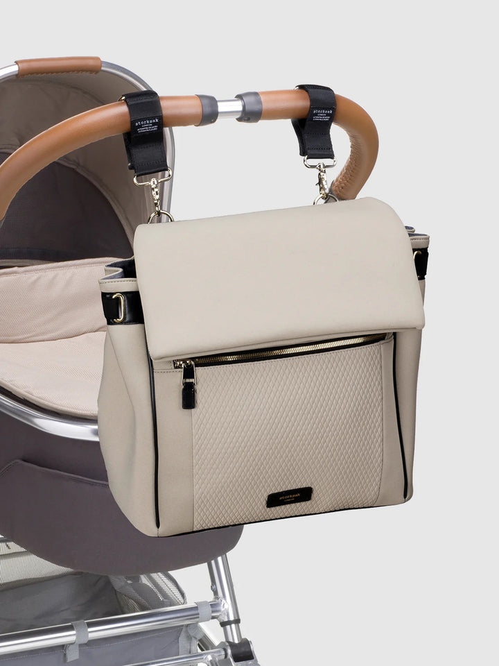 Clean lines and technical scuba combine to make the St James the most desirable convertible changing bag to date. Sports luxe styling does not compromise versatility the interchangeable silhouette means you can convert from backpack to shoulder bag seamlessly. WHATS INCLUDED * Changing mat with luxurious padding & pocket storage. Machine washable. * Matching insulated FAB bag (food & bottle) for additional storage * Matching stroller clips