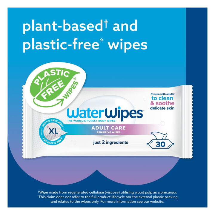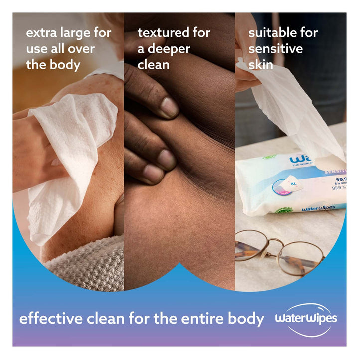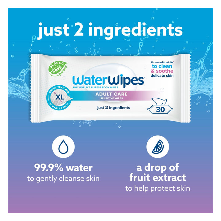Water Wipes Adult Care Sensitive Body Wipes are specially designed for gentle cleansing and personal hygiene. Each pack contains 30 wipes that are formulated with 99.9% purified water and a small amount of fruit extract, making them ideal for sensitive skin. These wipes are free from harsh chemicals, fragrances, and alcohol, ensuring a soothing and refreshing experience. Perfect for on-the-go use, they provide a convenient solution for maintaining cleanliness and comfort, whether at home or while traveling. Water Wipes are dermatologically tested and suitable for all skin types, offering a safe and effective way to stay fresh throughout the day.