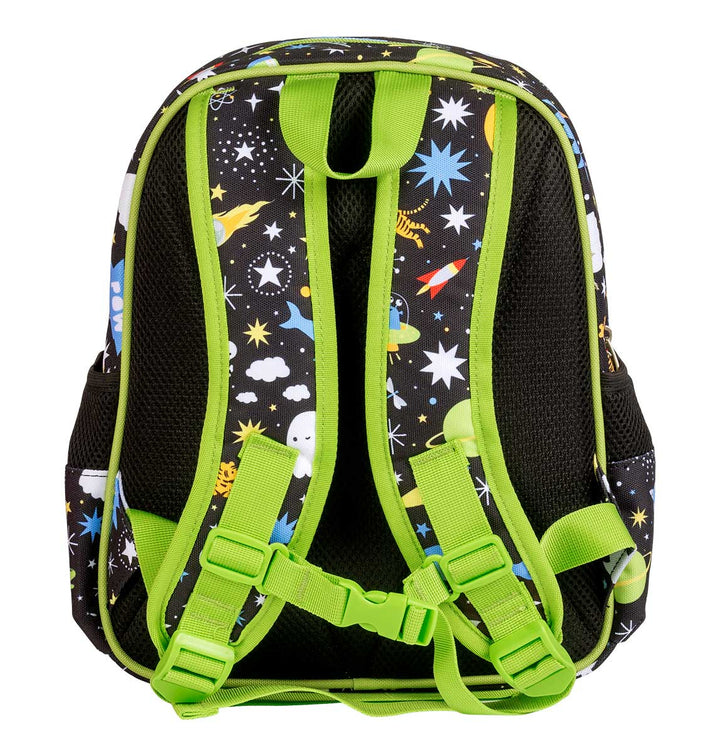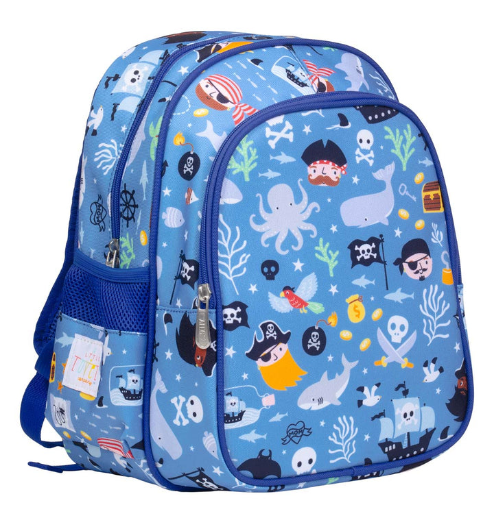 The practical, blue backpack with Pirates design is ideal for taking to school or travelling. The children's backpack has a spacious main compartment, an insulated front pocket and two open side pockets; big enough for a lunch box, a snack and a water bottle. The backpack features padded shoulder straps and a chest strap, so it won't easily slip off the shoulders. The back panel is lined with a breathable fabric for extra comfort. Complete the school set with a matching pencil case, lunch box and drink bottle with pirates print.