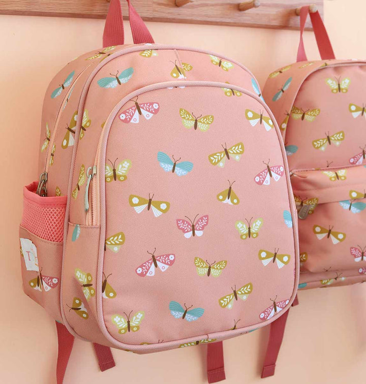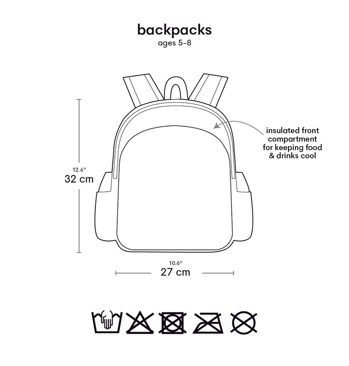 Lovely lightweight kids backpack with an insulated front pocket that ensures snacks and drinks stay cold (or warm). The front pocket easily fits a lunch box, drink bottle, and added snacks or fruit. The main compartment is large enough for all your school essentials. There is also an additional smaller pocket inside and two open drink bottle pockets on the sides. Thanks to the chest strap, the adjustable shoulder straps always stay in place. There is extra filling on the back panel, and it is has a breathable layer for extra comfort.
