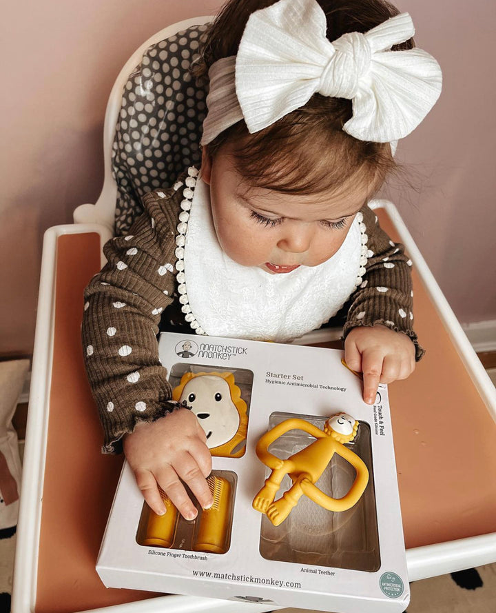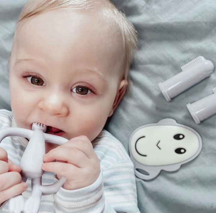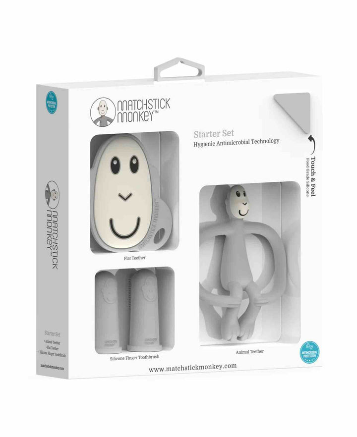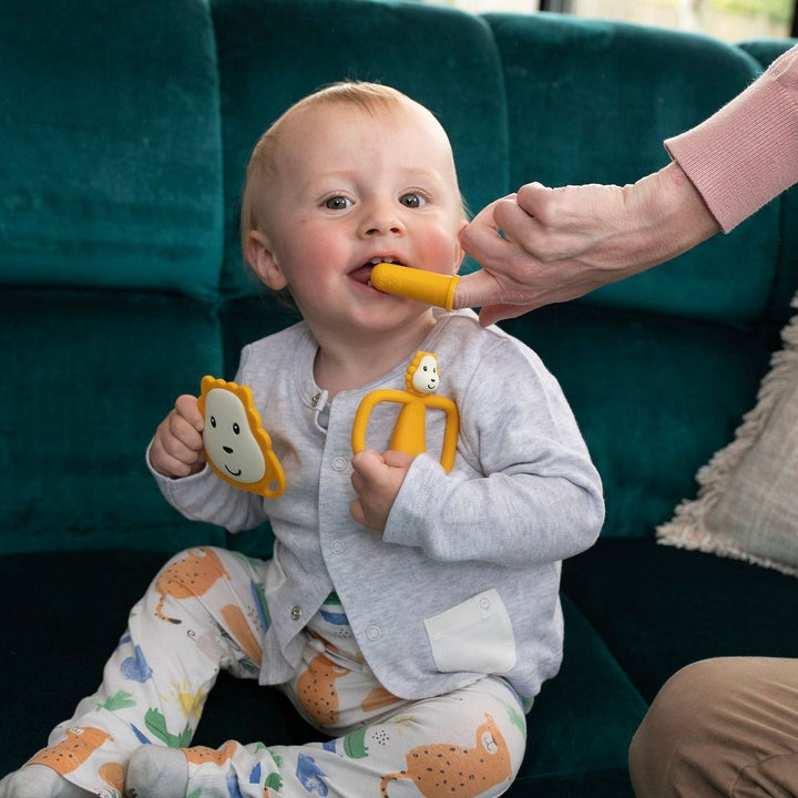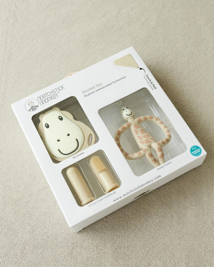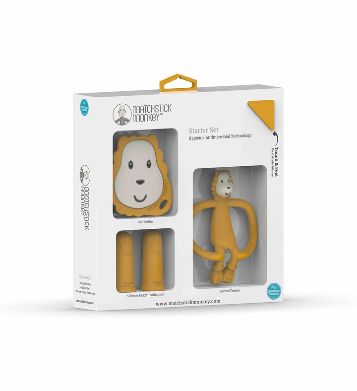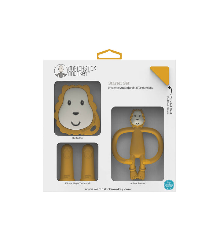 Our perfect Teething Starter set has all the essentials to soothe your little one’s teething pain Our Teething Starter Sets come in a range of different characters and colours! Our Monkey Teethers are fun, flexible and the textured bumps are getting to the source of pain quickly. The Flat Monkey Teethers are small, lightweight, and great for tiny hands - ideal to keep in your bag when you are on the go. Our Silicone Finger Toothbrushes are the perfect first toothbrush for your baby. Soft and gentle on the gums from the very first tooth. All protected with BioCote® Antimicrobial Technology reducing microbes on the surface making our products hygienically cleaner than any other teethers.