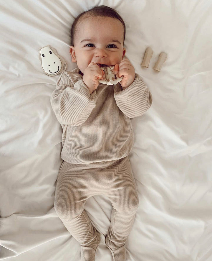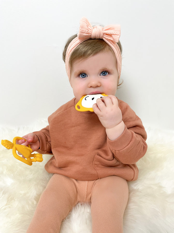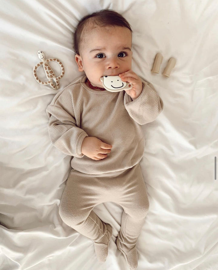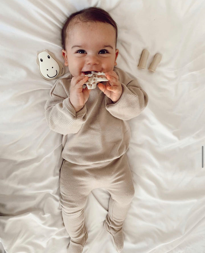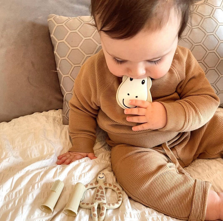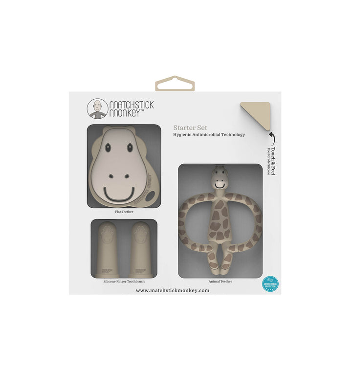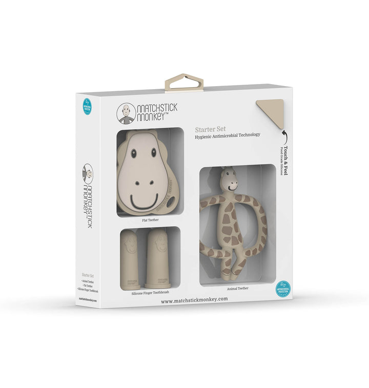 Our perfect Teething Starter set has all the essentials to soothe your little one’s teething pain Our Teething Starter Sets come in a range of different characters and colours! Our Monkey Teethers are fun, flexible and the textured bumps are getting to the source of pain quickly. The Flat Monkey Teethers are small, lightweight, and great for tiny hands - ideal to keep in your bag when you are on the go. Our Silicone Finger Toothbrushes are the perfect first toothbrush for your baby. Soft and gentle on the gums from the very first tooth. All protected with BioCote® Antimicrobial Technology reducing microbes on the surface making our products hygienically cleaner than any other teethers.