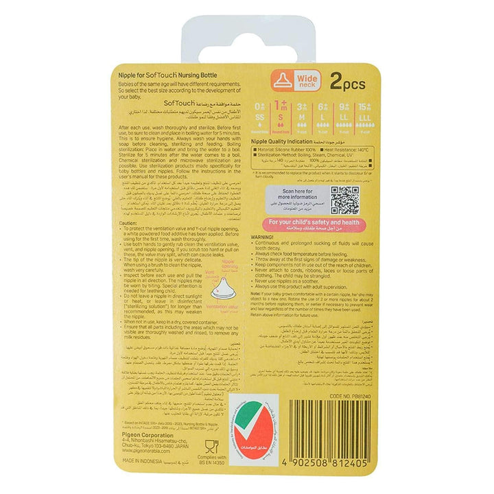 The Pigeon SofTouch Wide Neck Bottle Round Hole Nipples Small 2 PCS are designed to provide a natural feeding experience for your baby. The soft, flexible silicone nipples mimic the feel of a mother's breast, making it easier for your little one to transition between breast and bottle.
