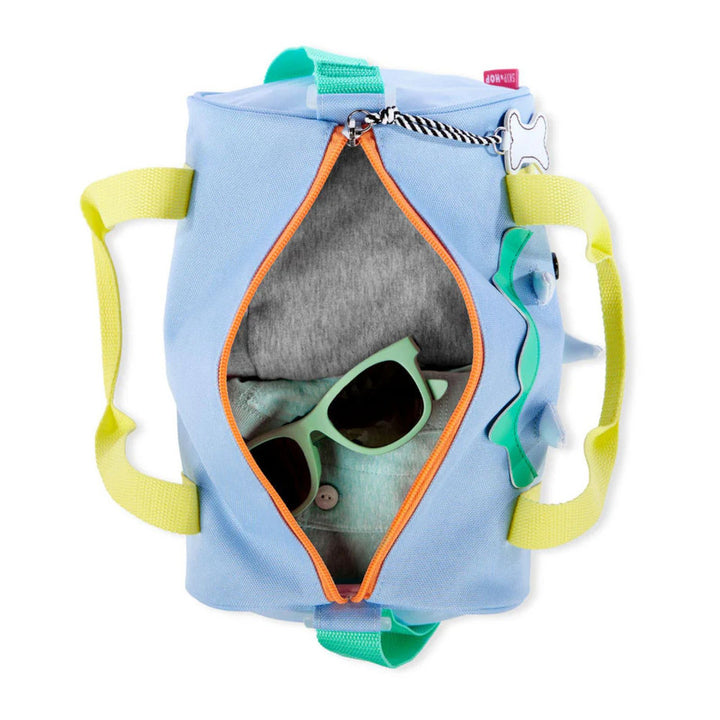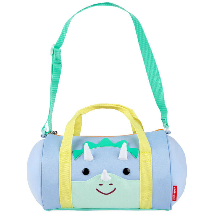 Make packing for sleepovers, sports, or camp easy and fun with the Skip Hop Duffimals Dino Duffel Bag. Designed for little adventurers, it features a playful dino face and a colorful design. The spacious interior with expandable pleated sides offers extra packing space, while the adjustable crossbody strap and two yellow top handles provide comfortable carrying options.