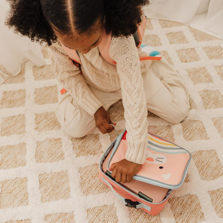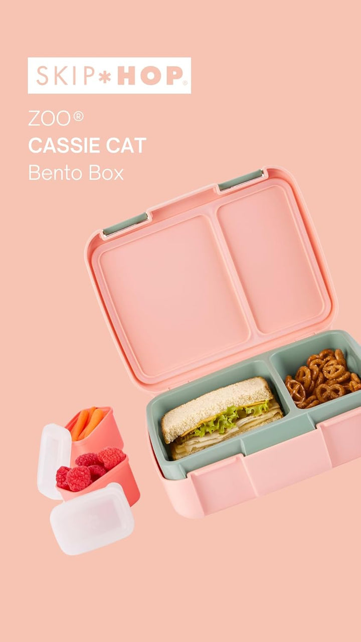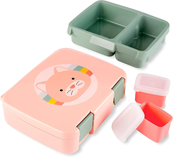 Make lunchtime fun and functional with the Skip Hop Zoo Bento Box Cat. Designed to encourage independent eating, this 4-piece lunch set features a playful cat design that toddlers will love. With easy-to-open clips and a smaller snack container that nests neatly inside, it's perfect for school meals or on-the-go picnics.