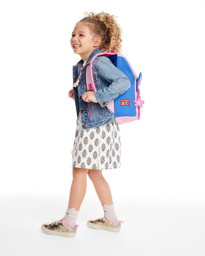 Perfectly sized for bigger kids, the Skip Hop Zoo Big Backpack Butterfly fits school folders, supplies, and lunch bags with ease. Designed for toddlers over 48 inches tall, this backpack features a wide, easy-access opening and a clear front pocket to quickly pack and find essentials. The elasticized mesh bottle pocket keeps drinks close, while adjustable padded straps ensure a comfortable fit. Made from easy-clean polyester, it’s decorated with fun 3-D butterfly details and signature Zoo® characters.