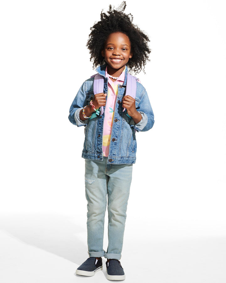Designed for bigger kids, the Skip Hop Zoo Big Backpack Narwhal fits school folders, supplies, a lunch bag, and more. With a wide, easy-access opening and a clear front pocket, packing and finding essentials is simple. The elasticized mesh bottle pocket keeps drinks within reach, while adjustable padded straps ensure a comfortable fit. Cute 3-D details and signature Zoo characters add playful charm.