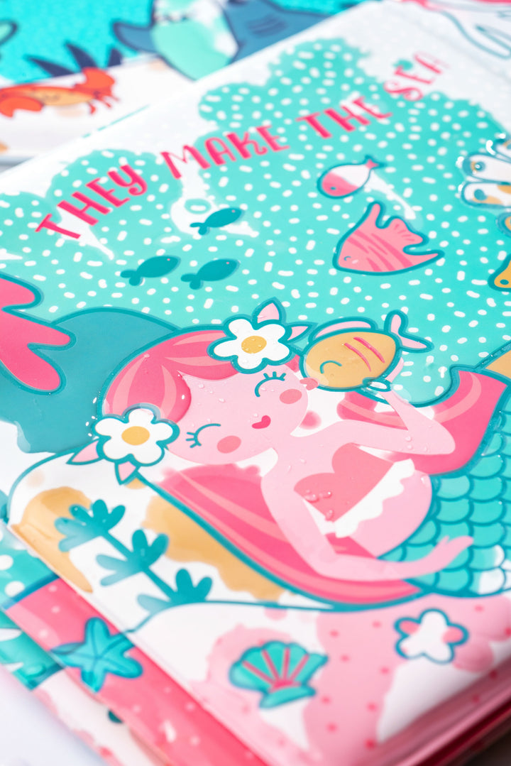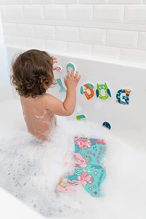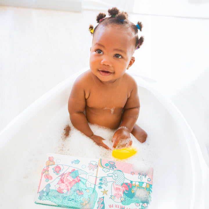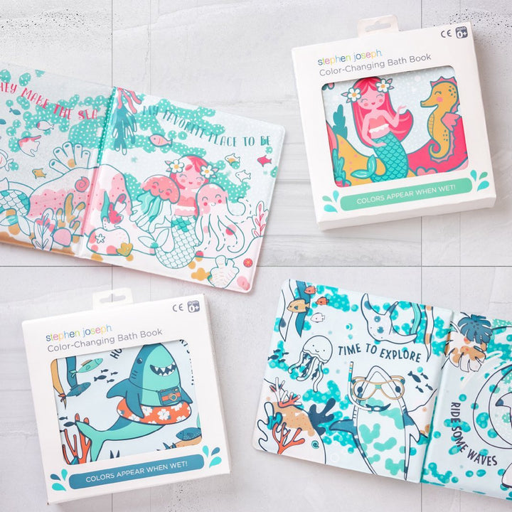 Splish-splash it’s time for a bath and floating, color changing books make bath time a magical experience! Each page in this PEVA bath book fills with bright colors when dipped in water. Read the adventures of mermaids and sharks in this soft bound book with quaint illustrations and colorful characters.