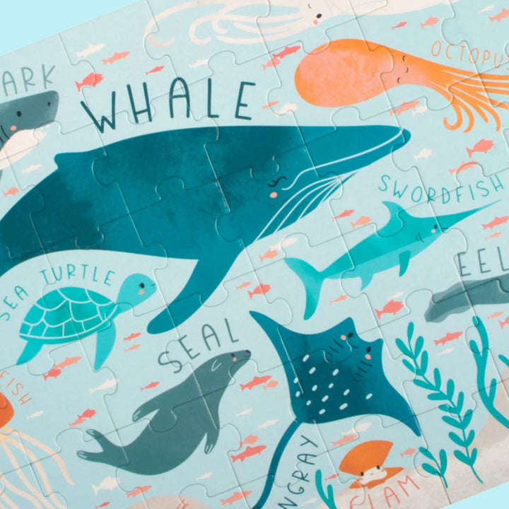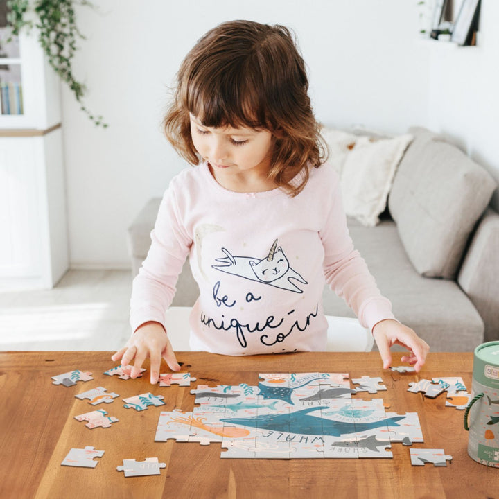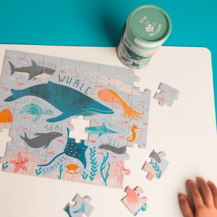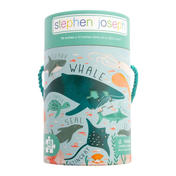 This 48-piece puzzle is sure to be a roaring success! Featuring three captivating animal-themed designs - sea life, animal kingdom, and dinosaurs - its an educational, kid-friendly activity thats hefty enough for parents to carry, with a sturdy cannister and rope handle. Theyll be wild about it!