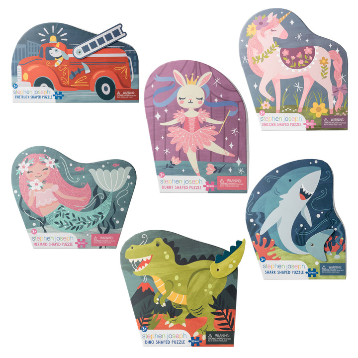 Create some indoor fun with our Stephen Joseph Shaped Jigsaw Puzzles! Help kids stay occupied inside with these colorful and bright character puzzles. Challenge kids to a classic pastime of puzzling while they learn dexterity, recognition, patience and concentration! Watch their faces fill with accomplishment when they complete the puzzle all on their own. Both the box and the puzzle feature fun, whimsically shaped puzzles comprised of 40+ pieces and generously sized at 20+" each (sizes vary by design). Dino, shark and firetruck boxes features moving parts, while bunny, unicorn, and mermaid boxes feature glitter accents.